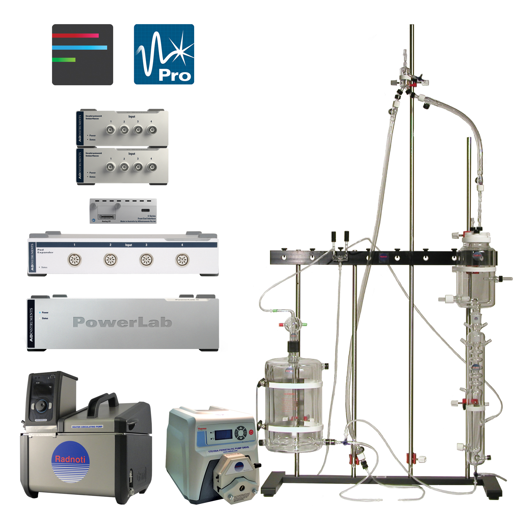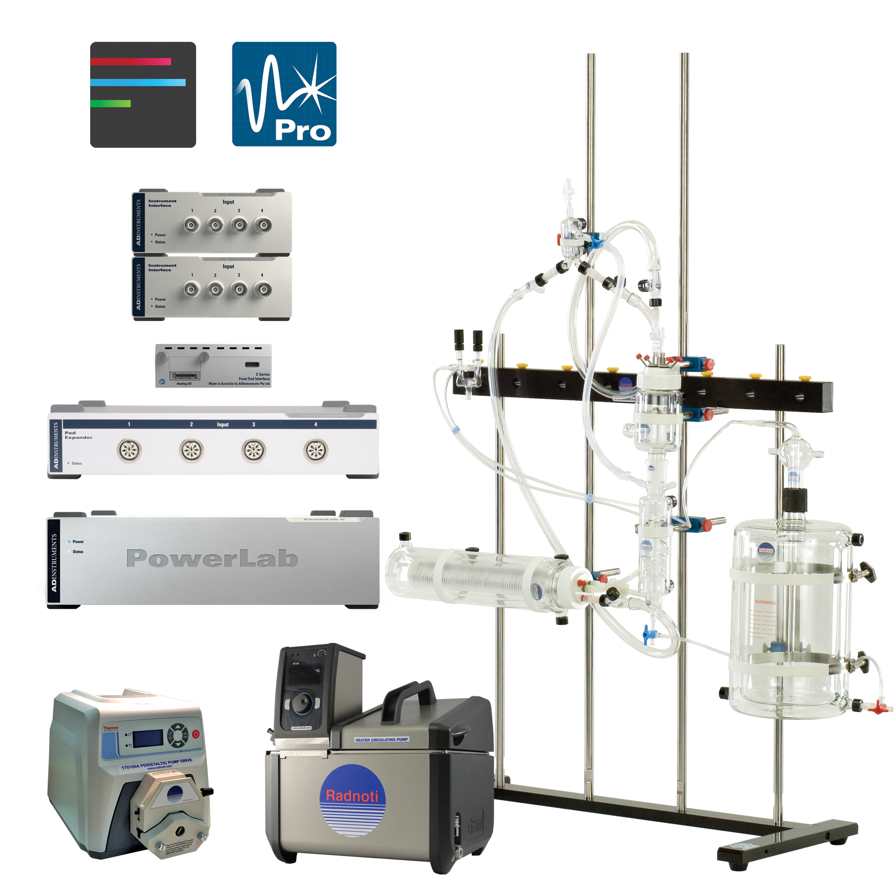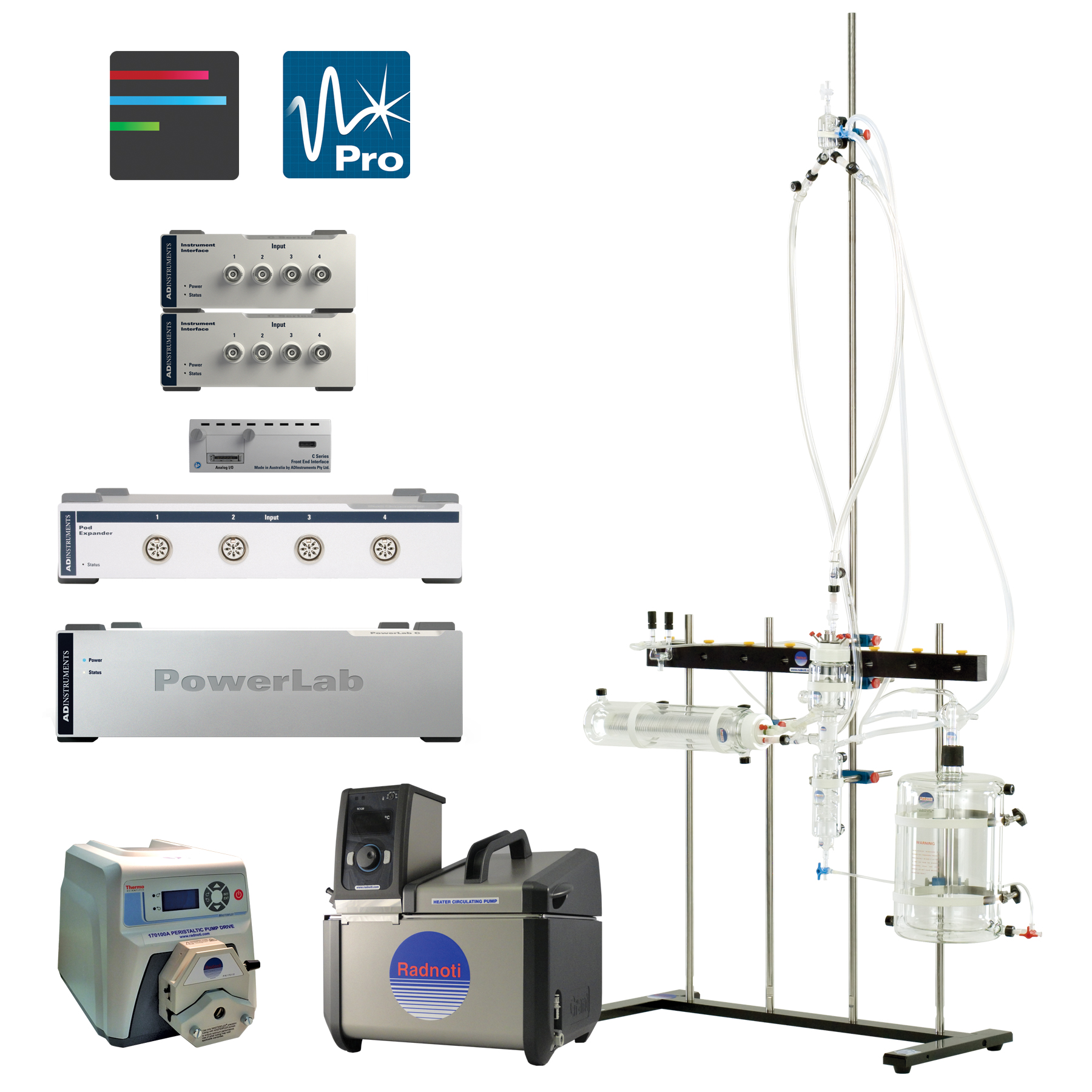 A foundation system for performing rat heart experiments using the Langendorff technique at a constant perfusion flow. It includes a 120106EZ/S-V Radnoti Rat Langendorff Constant Flow Apparatus (R), PowerLab C , LabChart Pro software, Pod Expander + C Series Front End Interface, and two C Series Instrument Interfaces. Please specify V = 115 or 220 for 115V or 220V.