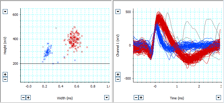 細胞外解析ソフトウェアでは、2つの分別方法を使用して、細胞外の神経スパイク活動をすばやく簡単に分別・解析します。識別されたスパイクは、振幅ヒストグラム、レートメーター、peristimulus histogram、自己相関グラムなどを含む専用のヒストグラム・ウィンドウで表示できます。