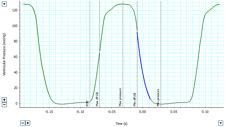 - Blood Pressure Settingダイアログでは、心室圧または動脈圧記録の検出および解析パラメータを簡単に設定できます。検出アルゴリズムは最小周期の高さと持続時間を使用し、検出された各周期にはラベルが付けられ、特定の波形パラメータが自動的に計算されます。周期の平均化と等容弛緩(Tau)オプションもダイアログで設定します。