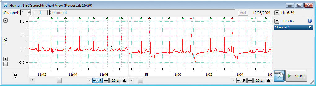 生データは計算によって変更されないため、心電図の再解析が可能です。ECG解析モジュールは、Windows PCに適しており、LabChart Proの一部として含まれているか、別途購入することができます。Chart、Beat Classification、Table、およびAveraging Viewは、解析対象のデータポイントへ迅速かつ簡単にナビゲーションできるようリンクされており、手動/ユーザーによるデータ編集は赤色で表示されます。