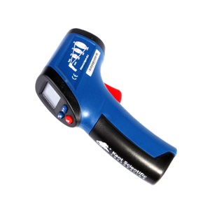 A non-contact infrared thermometer that measures temperature (Fahrenheit and Celsius) from -22 to 482 degree Fahrenheit (-30 to 250 degree Celsius) and is accurate within +/-3.6 degree Fahrenheit (2 degree Celsius). It fits comfortably in the palm of the hand, has a raised button on the top, and its emissivity is fixed at 9.5. Two replacement CR2032 batteries are included.