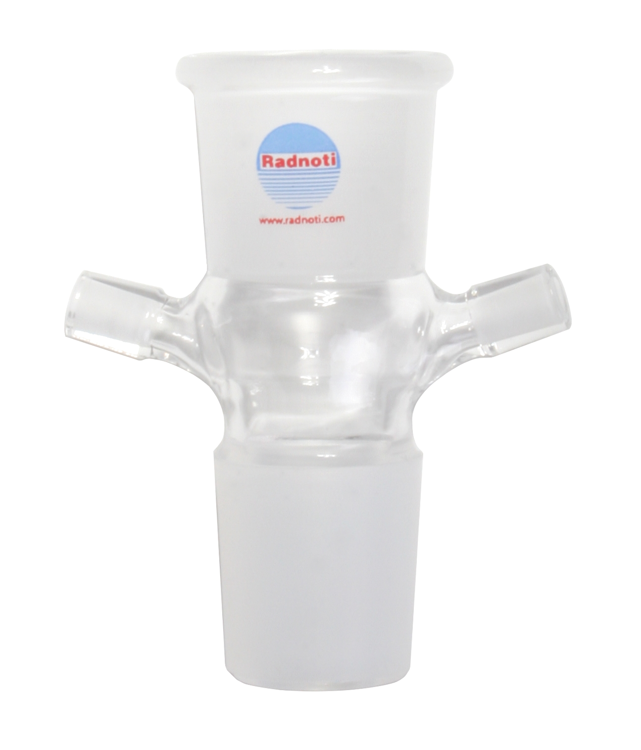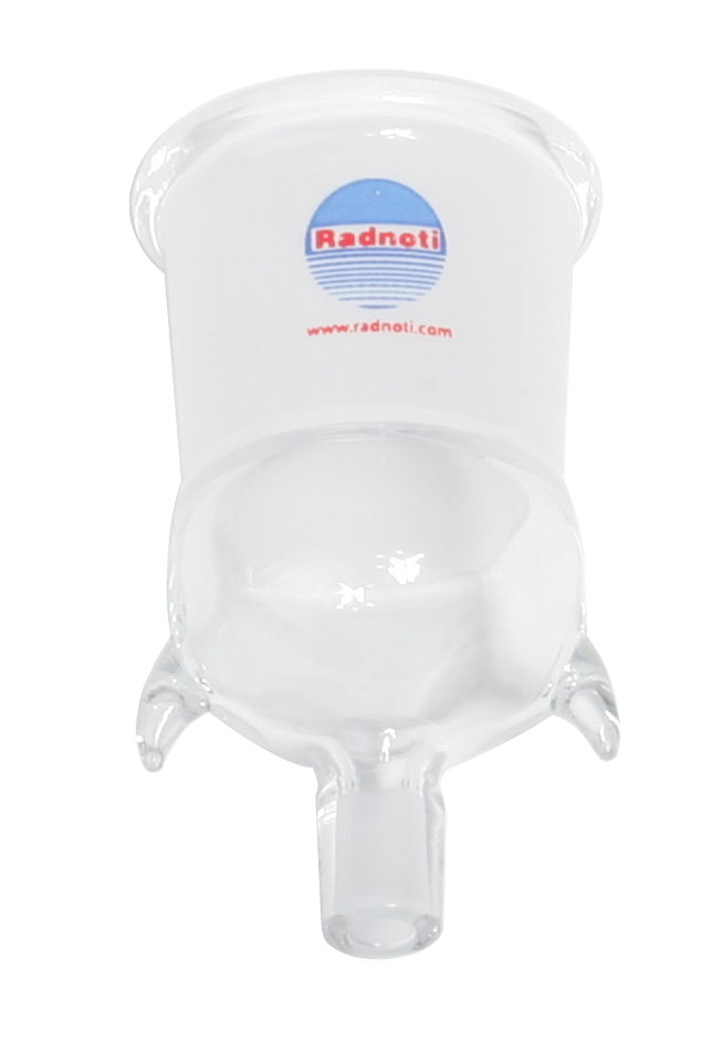 A borosilicate glass heart chamber adapter (24 mm Female to Male Port) that interfaces Radnoti Hi-Tech Heart Chamber to a Radnoti Post Heart Buffer Reservoir. It has two female Luer side ports that permit the addition of new medium or effluent sampling, as well as permitting the gassing of the heart chamber, such as nitrogen during hypoxia experiments.